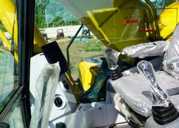 - Экскаватор имеет безопасную кабину с эргономичным рабочим местом оператора, большим ЖК-монитором, регулируемым сиденьем, современной климатической системой. Амортизаторы из силиконового каучука поглощают толчки от неровностей дороги и работы двигателя, а также от гидравлической отдачи. Они значительно улучшают устойчивость кабины и делают нахождение машиниста в ней более комфортным.